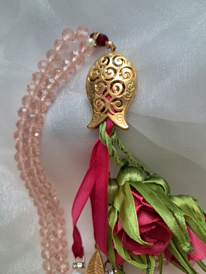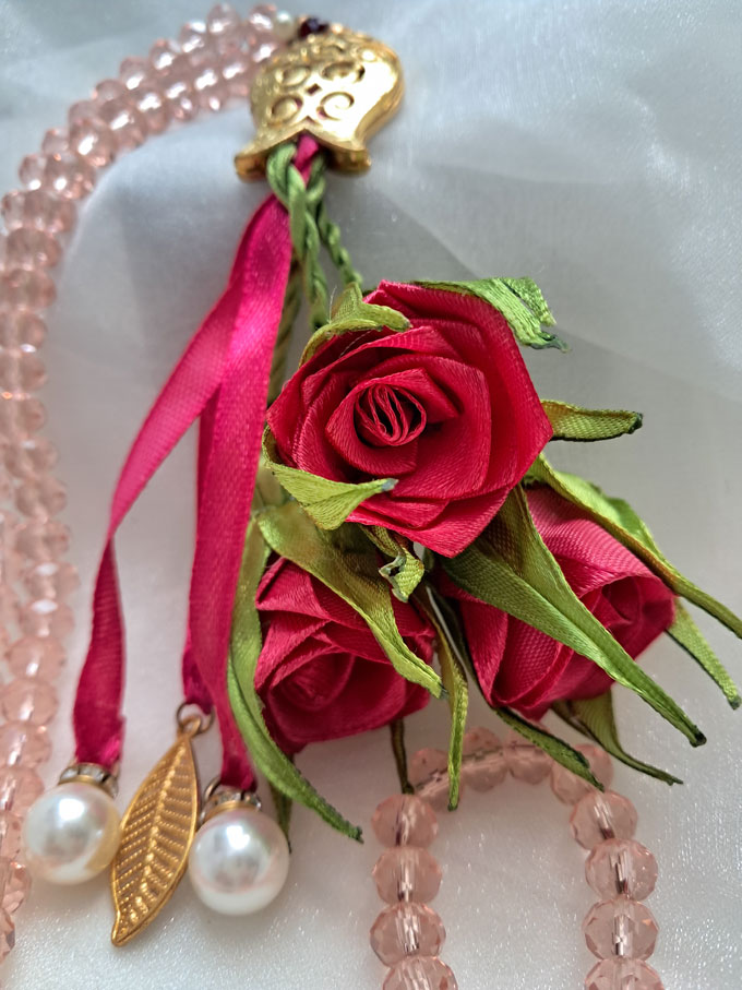 تسبیح صورتی با رز های سرخ آبی روباندوزی شده