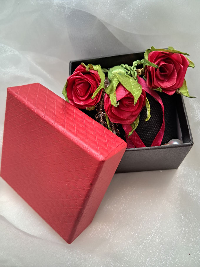 زیبایی این اثر با گلهای روباندوزی دستساز در رنگهای سرخ و آبی کامل شده است؛ ترکیبی که آن را به یک تسبیح منحصربهفرد و خاص تبدیل میکند.
