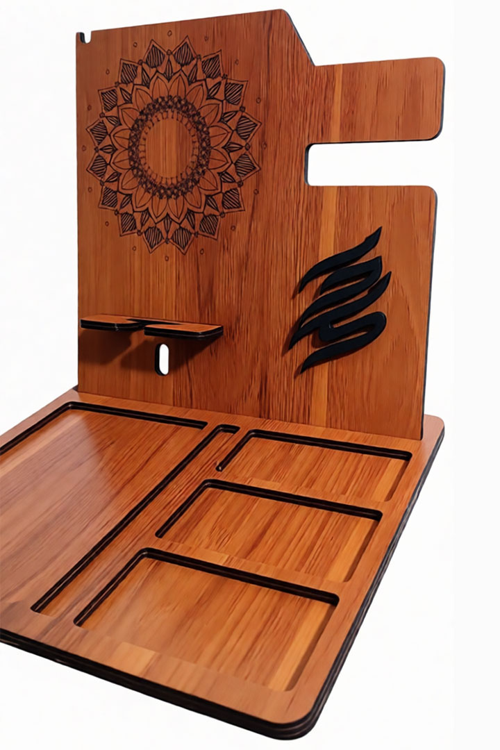 سازماندهی هوشمند و لوکس ملزومات روزمره خود را با این هولدر چندکاره تجربه کنید! طراحی منحصر به فرد با طرح ماندلا حکاکی شده، هولدر موبایل با سوراخ عبور کابل، جایگاه دو ساعت مچی، زائده آویزان کردن عینک و تقسیم‌بندی‌های متعدد برای کارت‌ها، انگشتر و اقلام شخصی. کف سه لایه و جنس ام دی اف 3 میل با طرح چوب، مقاومت و زیبایی را تضمین می‌کند. ایده‌آل برای میز کار، کنسول ورودی یا سرویس خواب.