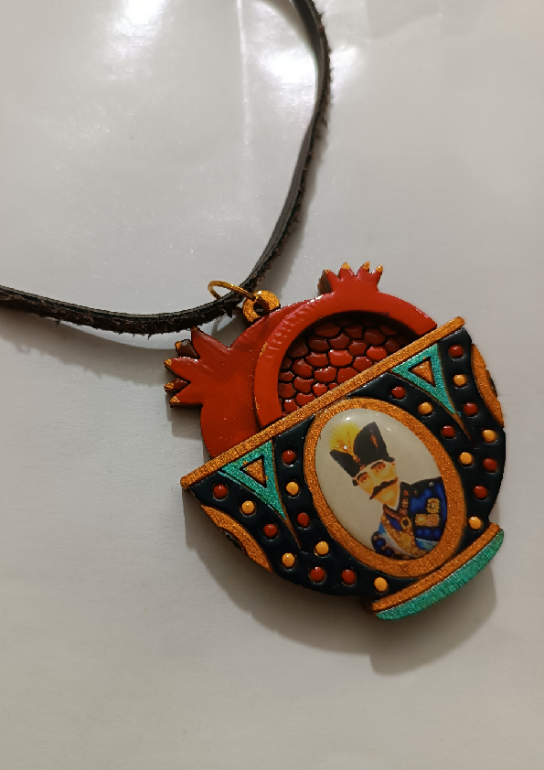 آویز چوبی با طرح انار و نقاشی مینیاتوری ناصرالدین شاه
