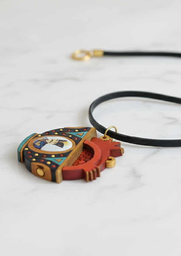 این گردنبند یلدایی با طراحی دستساز و تلفیقی از رنگهای گرم و نقوش اصیل ایرانی، یک اکسسوری خاص و متفاوت برای شب یلداست. آویز این گردنبند شامل طرح انار – نماد عشق، سلامتی و برکت – و یک تصویر مینیاتوری در قاب تزئینی است که جذابیت آن را دوچندان میکند.